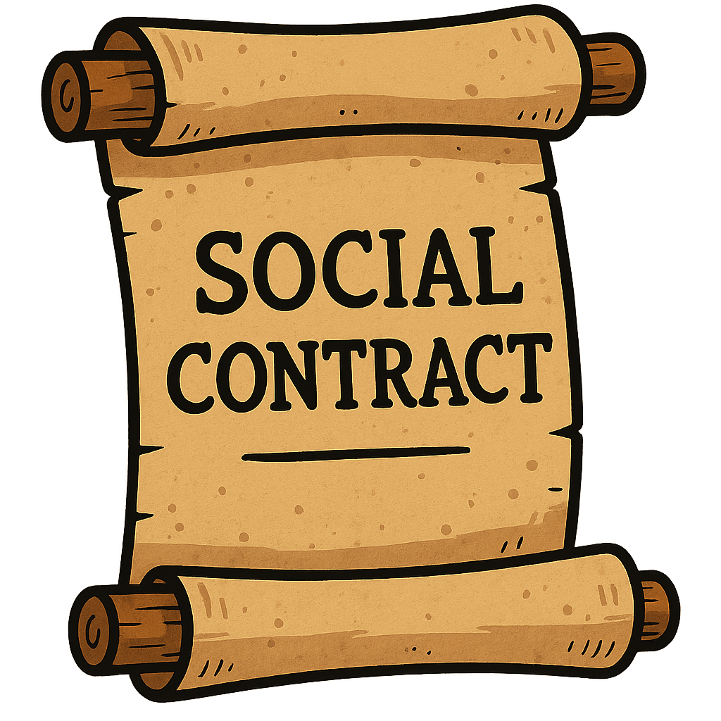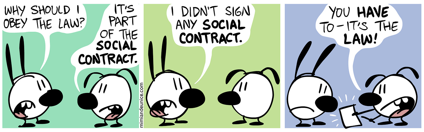 This section has identified a social contract with an implicit self-policing agreement between members of society to coordinate on a particular equilibrium in the game of life. Some apology is appropriate for those who find this terminology misleading. […] Words other than contract—such as compact, covenant, concordat, custom, or convention—might better convey the intention that nobody is to be imagined to have signed a binding document or to be subject to pre-existing moral commitments. Perhaps the best alternative term would be “social consensus”. This does not even carry the connotation that those party to it are necessarily aware of the fact. — Binmore (1994, emphasis mine)
