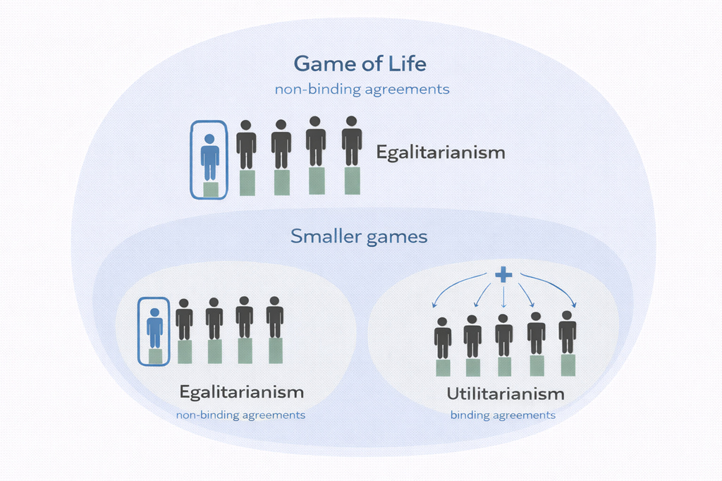 In other words, while an agreement can be utilitarian for single situations, it is only if this utilitarianism leads to a form of egalitarianism overall because the agreement over the Game of Life itself cannot be binding.