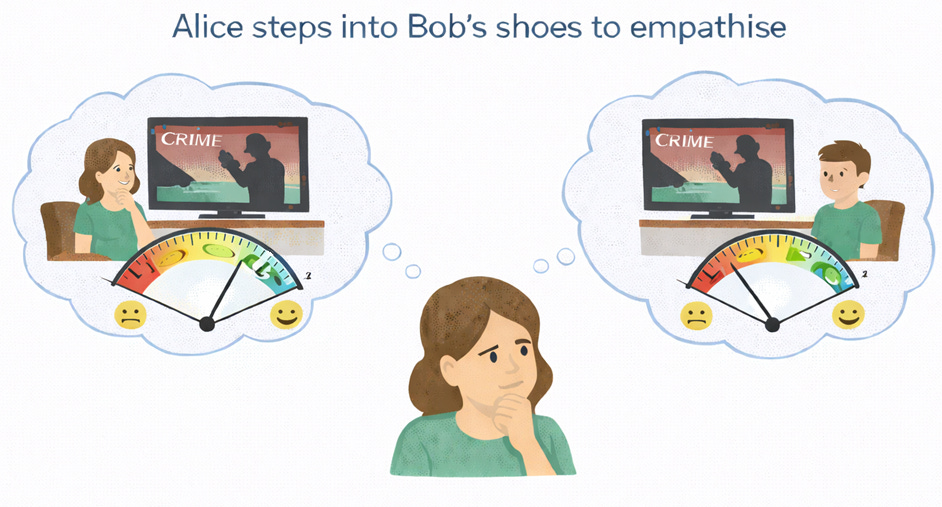 When Alice puts herself in Bob’s shoes while he is watching a sci-fi series, she must imagine whether Bob would be as happy in that situation as she would be watching crime dramas.6 Now, imagining the different solutions for sharing viewing time from her own point of view and Bob’s, she can choose the solution that is going to be amenable to both of them.