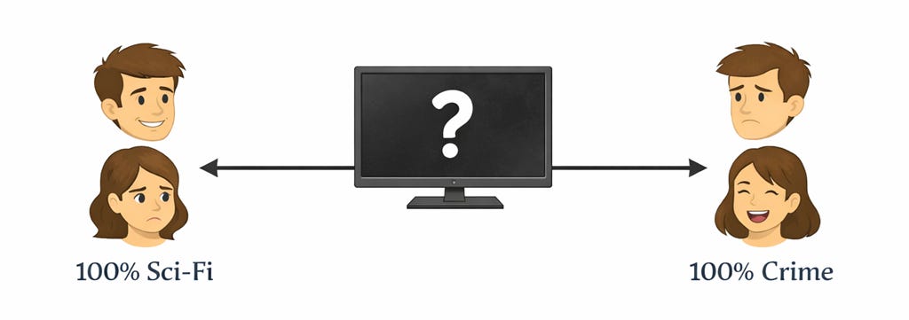 If Alice and Bob were utilitarians in their choice of television programme, they would choose the solution that maximises the sum of their satisfaction. Given that Alice enjoys crime dramas more than Bob enjoys science fiction series, they would end up watching crime dramas all the time.1