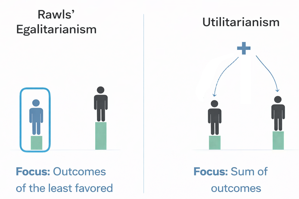 Note that utilitarianism allows us to care more for the most disadvantaged. Under the veil of ignorance, I might appreciate that the first few thousand dollars I could get as a poor person would be worth more to me than if I were a rich person. Hence, utilitarianism can justify caring more for the most disadvantaged people. What it does not allow is the absolute approach suggested by Rawls where only the outcomes experienced by the most disadvantaged people would matter to us.