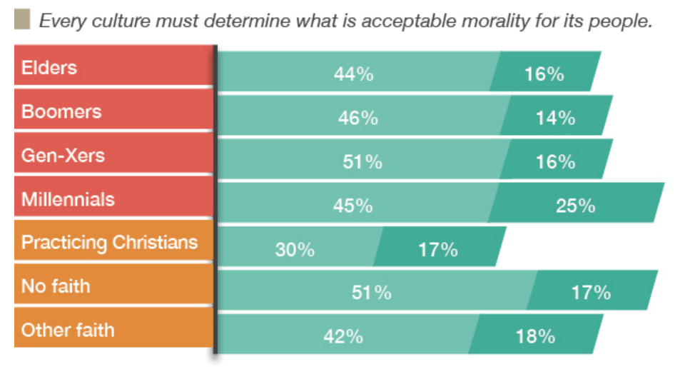 In a 2015 US poll, 65% of American adults agreed that “every culture must determine what is acceptable morality for its people.”1 And in a 2023 survey, 60% of “Gen Z” respondents agreed with the idea that what is morally right or wrong depends on what an individual believes.2