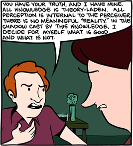 The inconsistency of postmodern relativism is well illustrated by the fact that its proponents regularly manage to arrive at their meetings on time even though, as pointed out by John Moore: