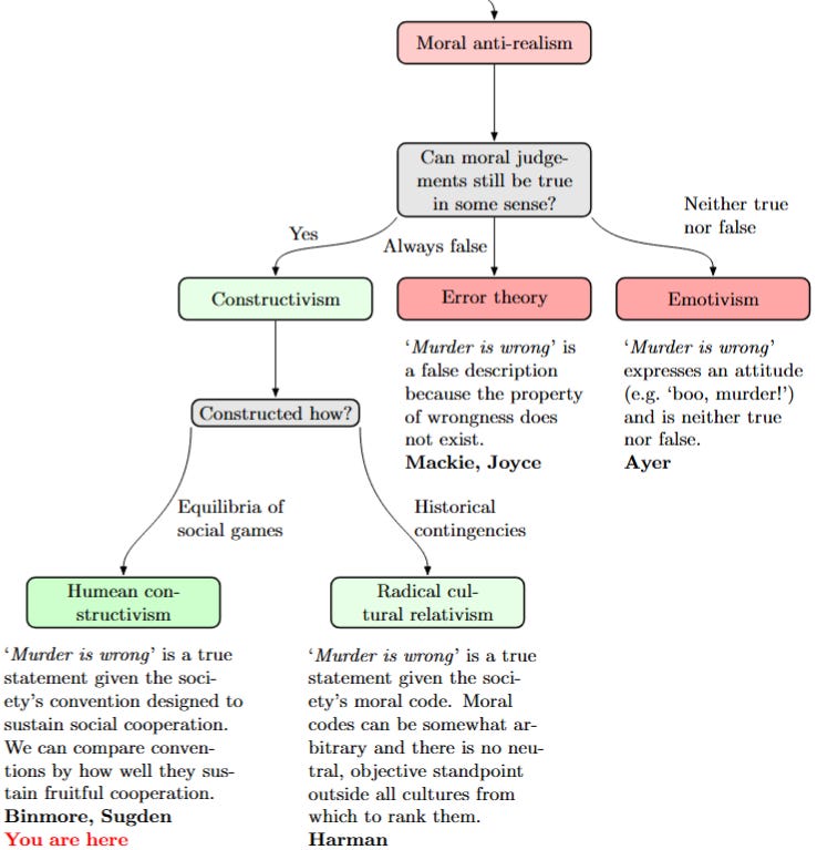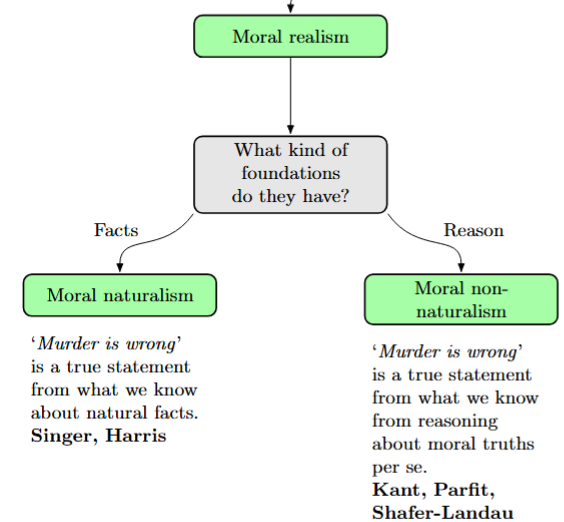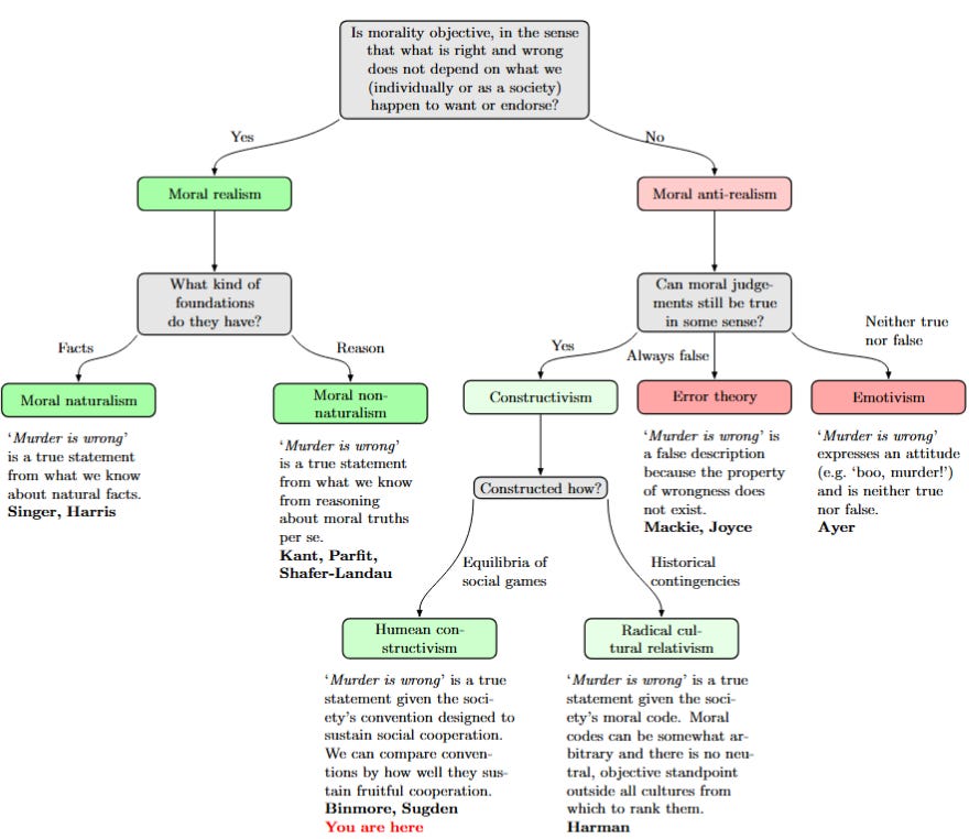 For philosopher readers: my choice of exposition is slightly different from common expositions in metaethics that start with a more fundamental question: Can moral claims be truth-apt (i.e. are there moral claims that can be either true or false)? I opted to start from the question “is morality objective?” as it seems a more intuitive way to enter the discussion for a general audience. The answer to the truth-apt question is automatically yes when answering that morality is objective, while it needs to be answered at the second level when morality is not objective. I also opted not to include every option out there (e.g. prescriptivism, subjectivism) for simplicity.