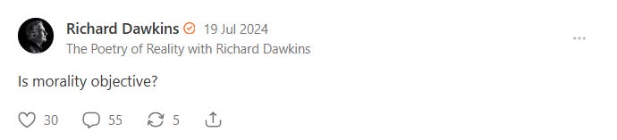 In a note last year, Richard Dawkins asked a simple question: is morality objective? Professional philosophers often put the question this way: are there statements that are truth-apt (they can be right or wrong) and whose truth is stance-independent (whether they are right or wrong does not depend on people’s thoughts or preferences about it).