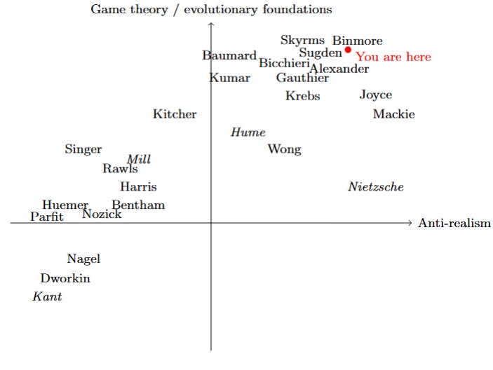 Another way to represent what distinguishes this position from most metaethical positions is to map these positions in a diagram distinguishing both realism from anti-realism and game-theoretical/evolutionary foundations from an absence of such foundations. The graph below does this for a non-exhaustive list of thinkers, blending classical philosophers and more modern thinkers.12