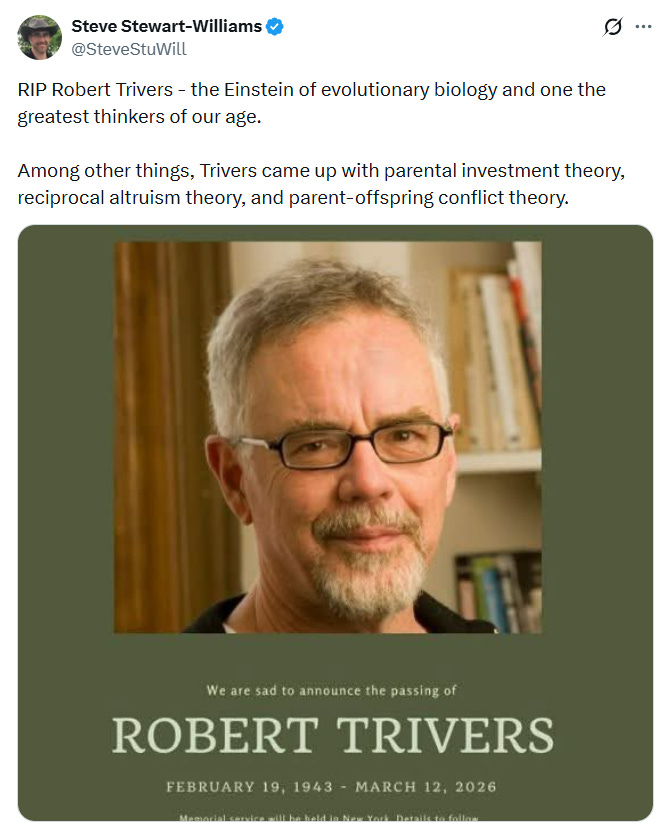 Steve Stewart-Williams announced early this week that Robert Trivers passed away.
