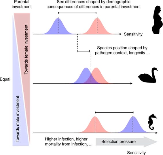 Critics of evolutionary theory sometimes argue that it does not make any predictions that can be tested and that it only rationalises what has already been observed. Trivers’ work is one of the best examples disproving this accusation. In his paper on parental investment, Trivers argues that the differences in behaviour between males and females should reflect the degree of asymmetry in their parental investment. As a result, animals with more parental investment asymmetry should show greater asymmetry than those with less, and if we ever find animals with role reversals, we should also observe reversals in strategies. And indeed, we observe that in animals with less asymmetry in parental investment, like swans, the differences between males and females are less noticeable. In the rare cases where male investments are larger, like in seahorses, where the females literally place their eggs in the belly of the male who incubates them, we observe a role reversal, with females courting males and competing for access to them.
