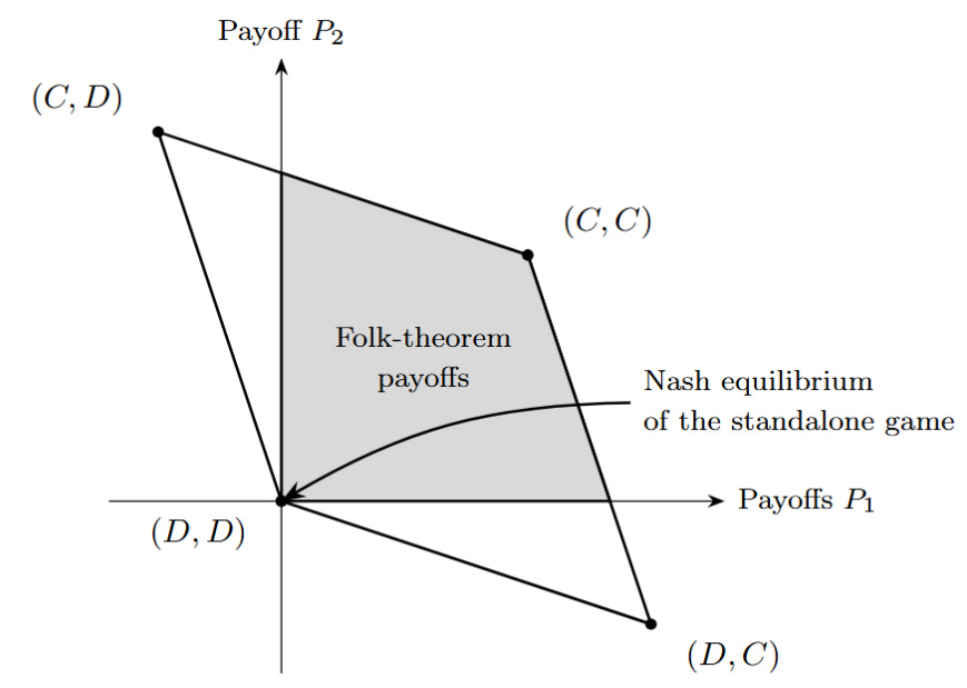 When this is the case, the Folk Theorem indicates that, via strategies like the grim strategy, a lot more average payoffs can be obtained than the payoffs of the defect-defect scenario of one-shot games. Indeed, it is possible for the players to reach all the average payoffs in the grey area in the graph if they are patient enough and the probability of the game repeating is large enough.