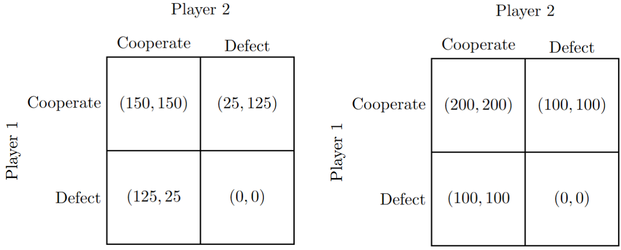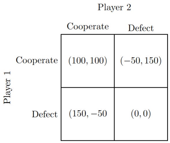 The Prisoner’s Dilemma is one of the most famous games from game theory. In it, two prisoners are presented with opportunities to “rat” out the other to get a better deal from the police. They can choose to stay silent (cooperate with each other) or to talk (defect). The paradox of the Prisoner’s Dilemma is that both players have an individual interest in defecting. But if they follow their individual interest and both defect, then they end up in a situation where they are worse off than if they had both stayed silent. This is somewhat frustrating, and that is the reason it is a “social dilemma”. The more general lesson is that there are situations such that when everybody follows their individual interest, everybody ends up worse off than if they had cooperated.