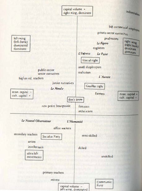 Here is the original graphic published in Distinction. The vertical axis distinguishes individuals with high levels of both economic capital (wealth) and cultural capital (education) from those with low levels of both. The horizontal axis contrasts those with relatively more cultural capital on the left and those with relatively more economic capital on the right.