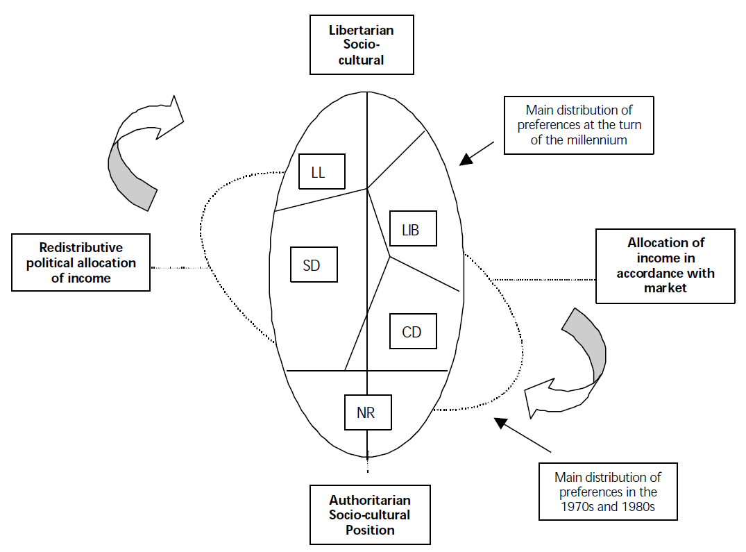 Here are original diagrams from Kitschelt (2003). Note that the vertical axis is reversed compared to the political compass, with authoritarian positions at the bottom.