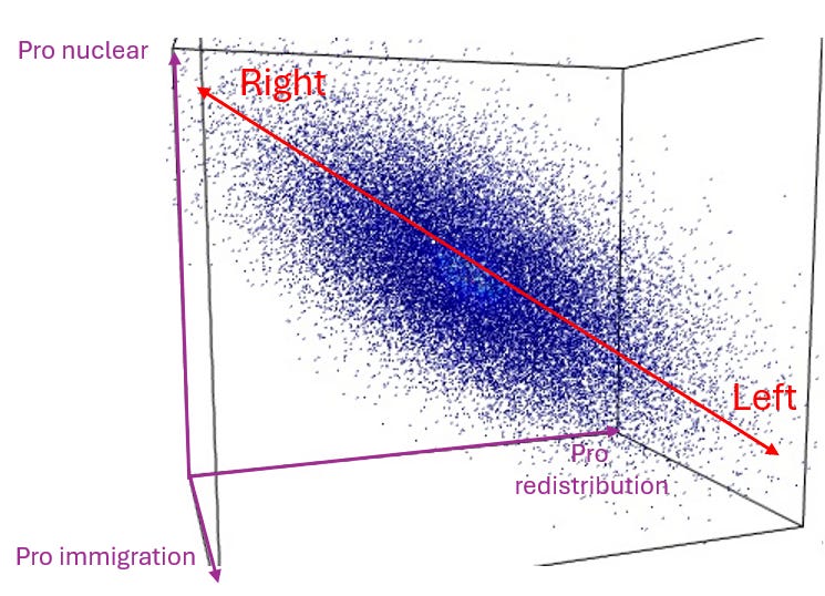 Consider, for instance, a hypothetical political space based on responses to just three issues: support or opposition to redistribution, nuclear energy, and lowering immigration. Given an individual’s answer to each of these questions on a scale from –10 (strongly opposed) to +10 (strongly in favour), that person can be located in a three-dimensional space. When a large number of individuals are placed in this space, they form a cloud of points. If answers are somewhat correlated (e.g. people relatively more in favour of redistribution also tend to be relatively more supportive of immigration), then the cloud will take on an oval shape. The line connecting the opposite poles of this oval shape, technically, the principal component, can be thought of as the natural dimension of political opposition that best summarises the main divide in the population.