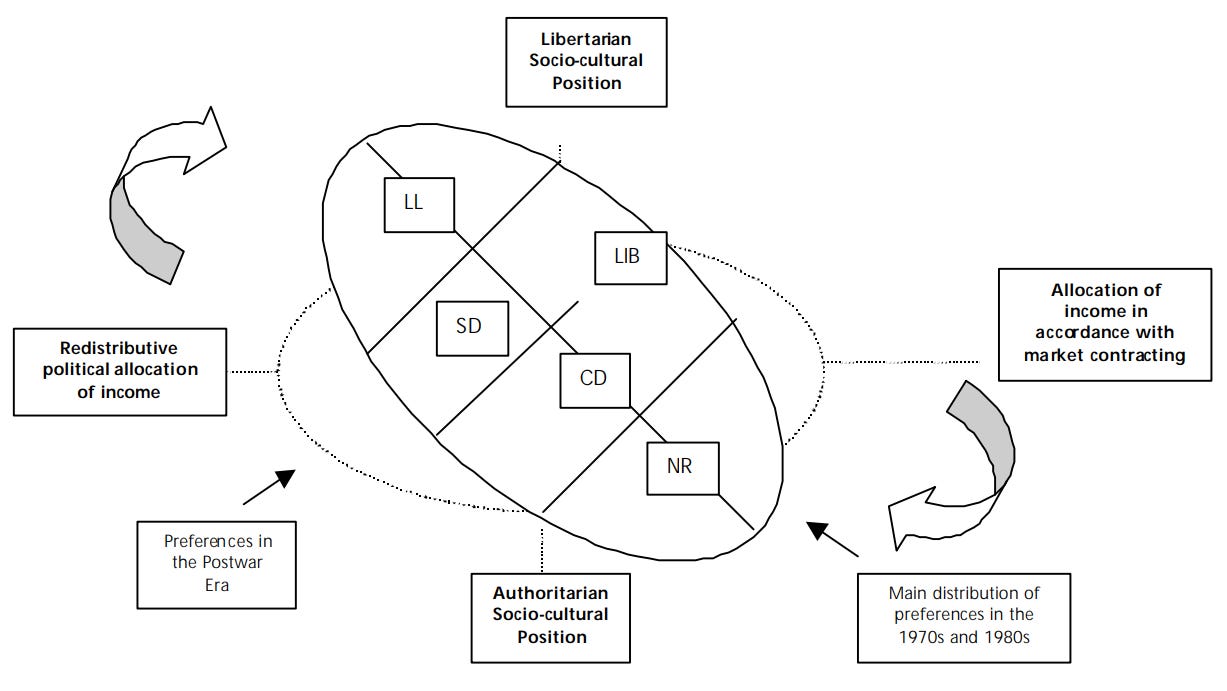 The idea of these two political dimensions was promoted by Eysenk (1954), Nolan (1971) and Kitschelt (1994).