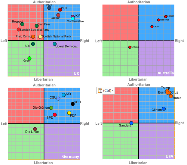 Applying these tests to the positions of major parties in Western countries shows that the left–right dimension generally extends from the left-libertarian to the right-authoritarian quadrant.