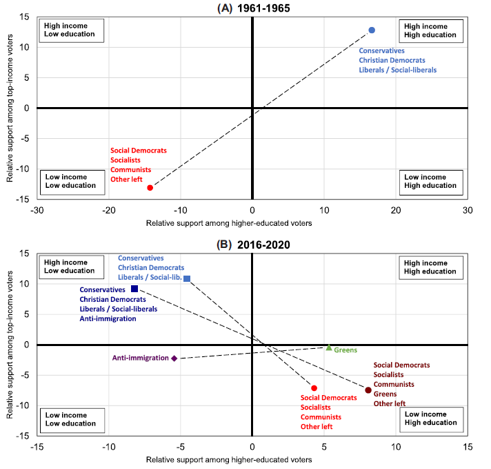 One fact that has surprised many observers is that as high education high income voters have shifted to left parties, they have also shifted left on economic issues, while the reverse has happened on the right, particularly in the US.