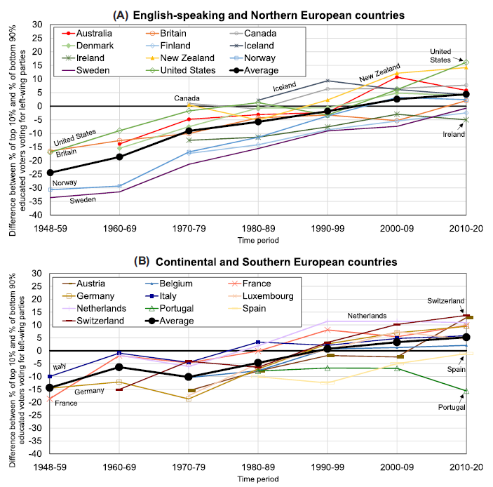 Piketty had found a result similar to that of Kitschelt, whom he cited at the time. Twenty years later, Piketty published evidence that a demographic shift was accompanying this political evolution, not just in France but in other Western countries too. From the postwar era to the 2010s, support for left-wing parties progressively gentrified, with highly educated voters increasingly voting more for the left than less educated voters.
