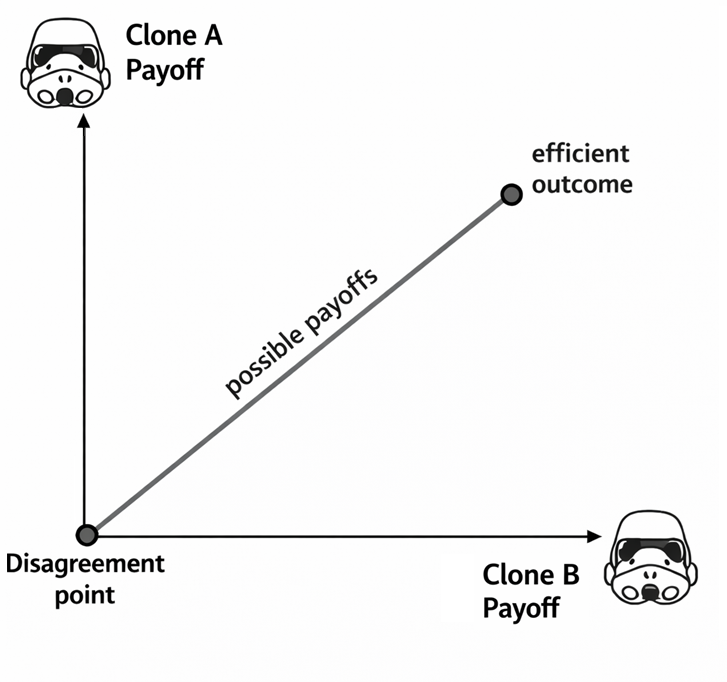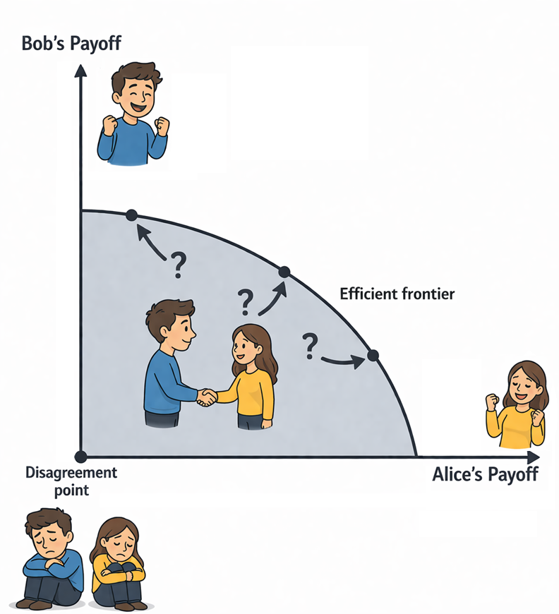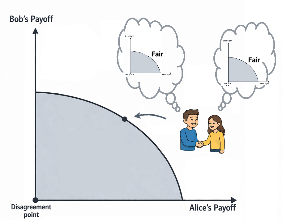 It is common to represent this problem with the picture below. By cooperating, Alice and Bob can get benefits. A social contract organises their cooperation and determines both the benefits and their splits. Some social contracts leave some potential benefits untapped: either Alice, or Bob, or both could get more with a better agreement. A pattern of cooperation is efficient when it is not possible to improve the outcome of anybody anymore without making some people worse off. In short, a social contract is efficient when it does not leave any money on the table. There are typically many efficient social contracts.2