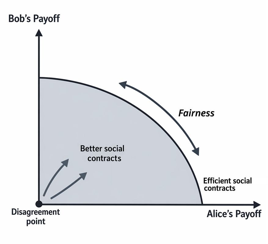 Yet, from Binmore’s perspective, the standard fairness-versus-efficiency dilemma vanishes. The reason is that it rests on an ill-posed question: fair relative to what? For Binmore, fairness concerns how the gains from cooperation are shared. That immediately separates two issues. First, society should make cooperation as productive as possible and therefore consider only efficient social contracts. Second, among those efficient social contracts, society should choose one. That is where fairness comes in. Fairness norms are used to select one among them.